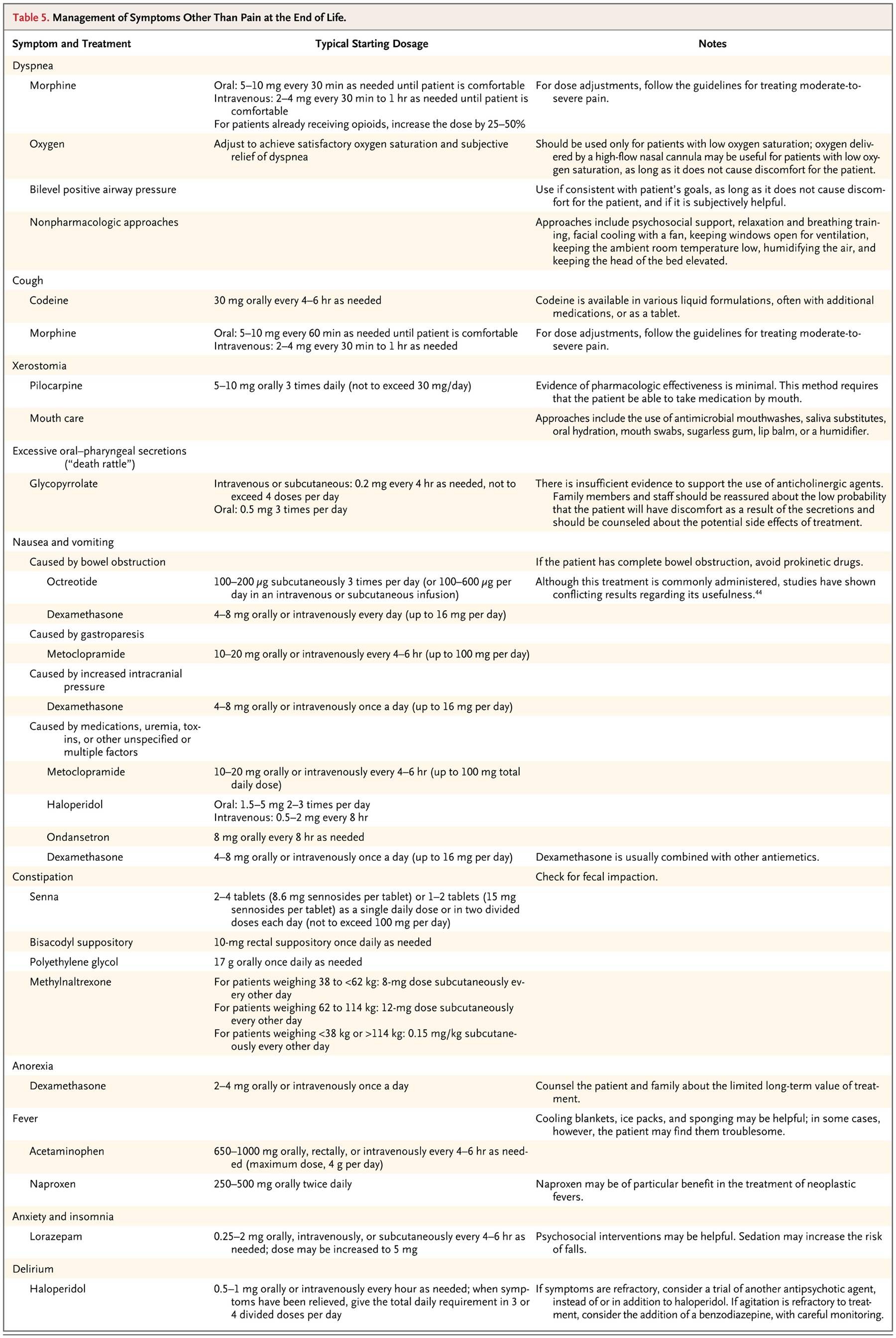 Pain is not only common but often the most feared symptom experienced by patients at the end of life. Ongoing assessment is essential to ensuring comfort. For somnolent patients, attention should be paid to nonverbal indicators of pain (e.g., furrowing of the brow, grimacing, rubbing a part of the body repetitively, or moaning). The table below summarizes recommendations for pain management of acute pain for actively dying patients. An additional route of administration that is more common for patients at the end of life is the subcutaneous route.