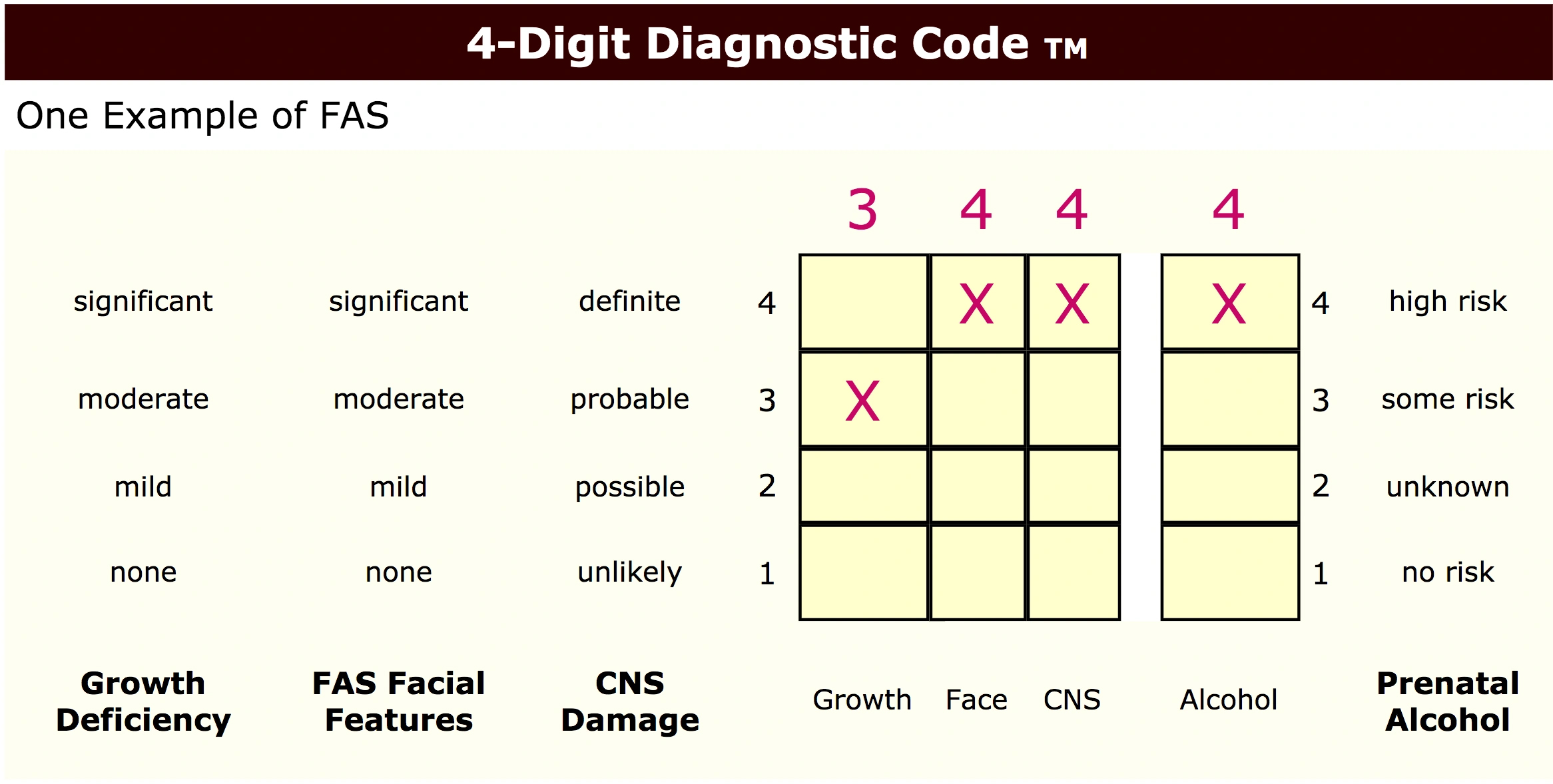 FASD 4-Digit Diagnostic Code: The University of Washington developed this tool to aid multidisciplinary teams in the diagnosis of FASD: “The four digits reflect the magnitude of expression of four key diagnostic features of FASD (growth deficiency, the FAS facial phenotype, CNS abnormalities, and prenatal alcohol exposure). The magnitude of expression of each feature is ranked independently on a 4-point Likert scale.”